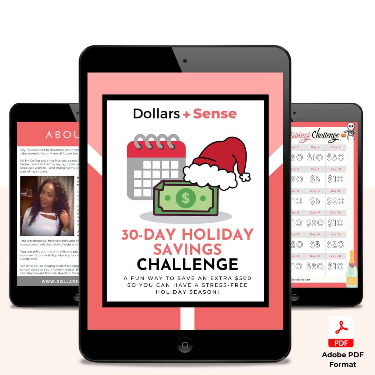 A 5-page 30-Day Holiday Savings Challenge workbook that is both PRINTABLE and FILLABLE. This means you can insert information digitally on your computer before you print it out.