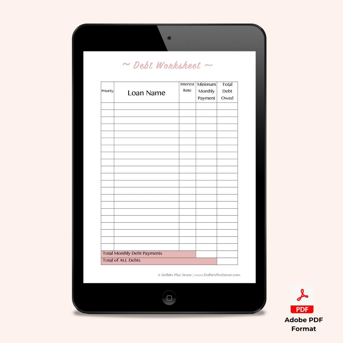 A one-page Debt Worksheet that can be used digitally using the free Adobe Acrobat Reader program, a digital note-taking app like GoodNotes, or printed and filled by hand.